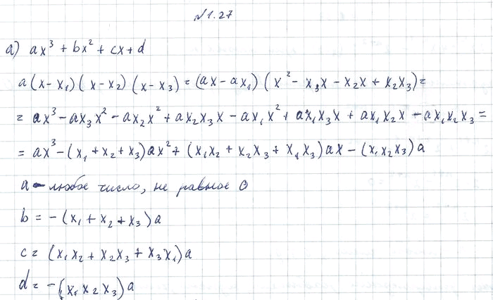 1.27. а) Пусть многочлен ах3 + bx2 + сх + d тождественно равен многочлену а(х - х1)(х - х2)(х - х3). Выразите коэффициенты а, Ь, с и d через числа х1, х2, х3.