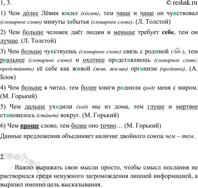 1) Чем долее Лёвин к..сил тем чаще и чаще он чувствовал минуты з..бытья. (Л. Толстой) 2) Чем больше человек даёт людям и меньше требует себе тем он лучше. (JI. Толстой) 3) Чем больше чу(?)ствуешь связь с род..ной тем р..альнее и охотнее пр..дст..вляешь её себе как ж..вой орг..низм. (А. Блок) 4) Чем больше я читал тем более книги р..днили меня с миром. (М. Горький) 5) Чем дальше уходили мы из дома тем глуше и мертвее становилось вокруг. (М. Горький) 6) Чем проще слово тем более оно точно... (М. Горький)