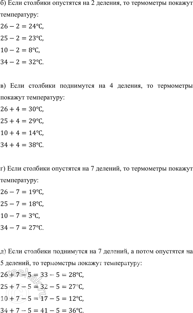 д) Если столбики поднимутся на 7 делений, а потом опустятся на 5 делений, то термометры покажут температуру: