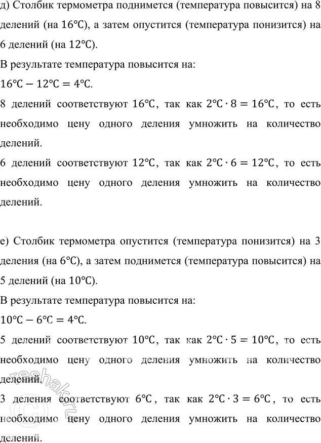 д) Столбик термометра поднимется (температура повысится) на 8 делений (на 16C), а затем опустится (температура понизится) на 6 делений (на 12C).