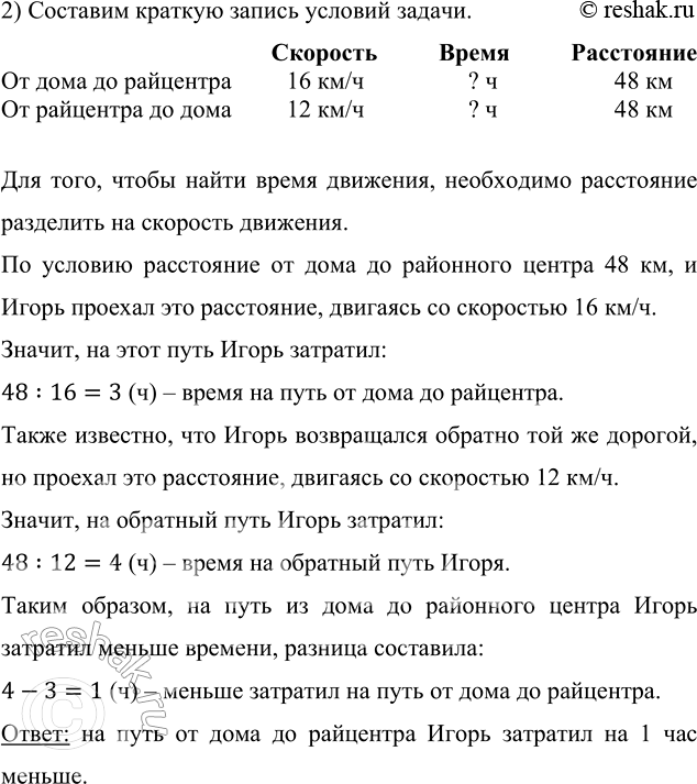 2) Игорь живёт на расстоянии 48 км от районного центра. Путь от дома до районного центра он проехал на велосипеде со скоростью 16 км/ч, а обратный путь по той же дороге он проехал со скоростью 12 км/ч. На какой путь Игорь затратил меньше времени и на сколько часов?