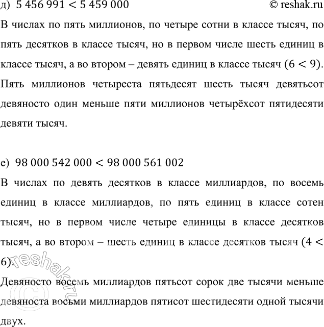 б) 562 или 499; г) 9354 или 9345; е) 98 000 542 000 или 98 000 501 002.