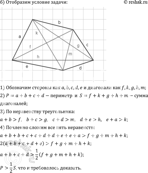 б) Докажите, что периметр выпуклого пятиугольника больше полусуммы длин eгo диагоналей.