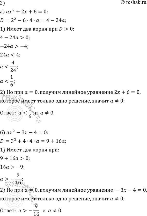 а) ах^2 + 2х + 6 = 0; б) ах^2 - Зх - 4 = 0?