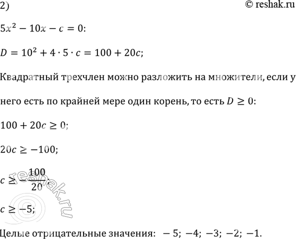 Найдите все целые отрицательные значения с, при которых квадратный трёхчлен 5х^2 - 10х - с можно разложить на множители.