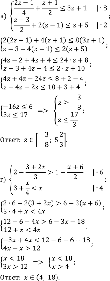 в) {(2z-1)/4+(z+1)/2?3z+1, (z-3)/2+2(z-1)?z+5};