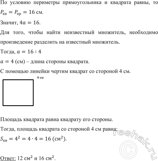 Начертите прямоугольник со сторонами 6 см и 2 см. Постройте квадрат, периметр которого равен периметру этого прямоугольника. Вычислите площади прямоугольника и квадрата.