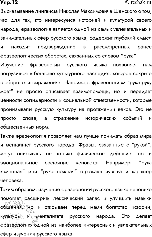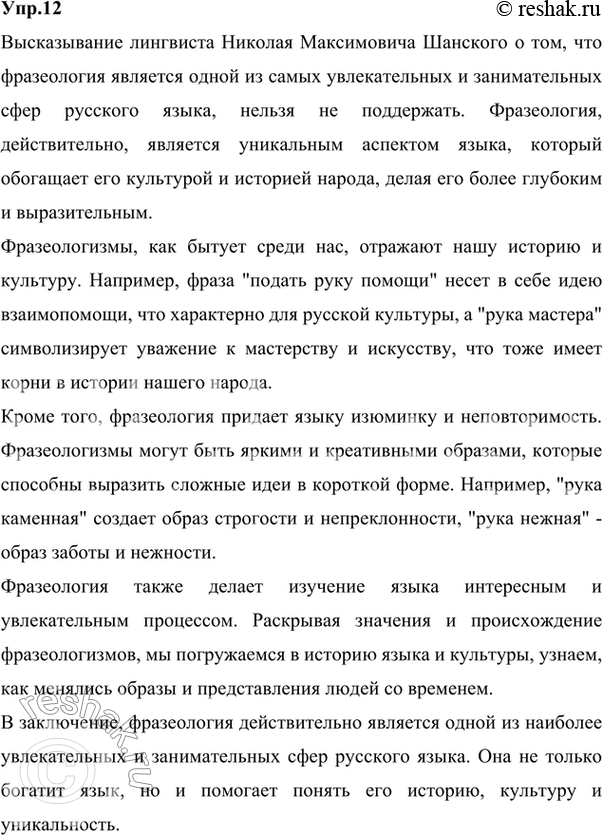 Напишите сочинение-рассуждение, раскрывая смысл высказывания лингвиста Николая Максимовича Шанского: «Для тех. юго интересуется историей, культурой своего народа, фразеология — одна из самых увлекательных и занимательных сфер русского языка». Аргументируя свой ответ, приведите примеры из текста предыдущего упражнения.