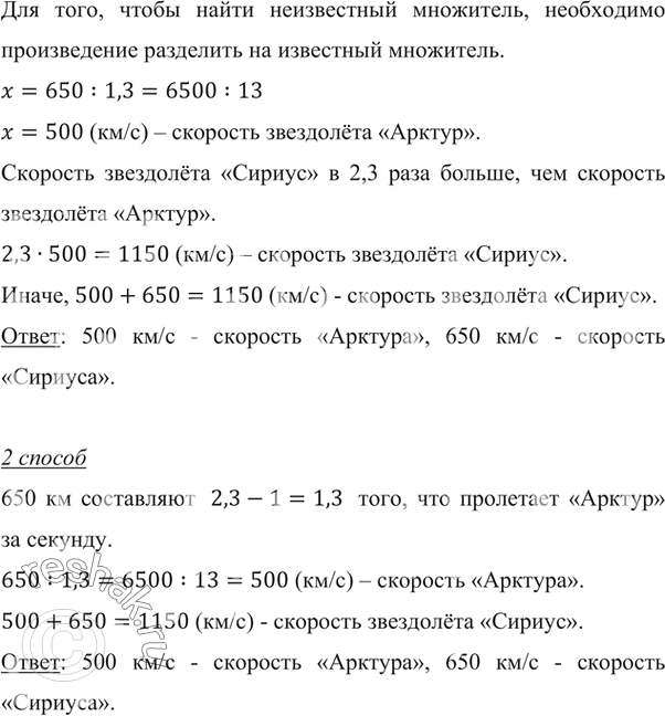 Звездолёт «Сириус» пролетает за 1 с на 650 км больше, чем звездолёт «Арктур». Найдите скорость каждого звездолёта (в километрах за секунду), если скорость «Арктура» в 2,3 раза меньше, чем скорость «Сириуса».