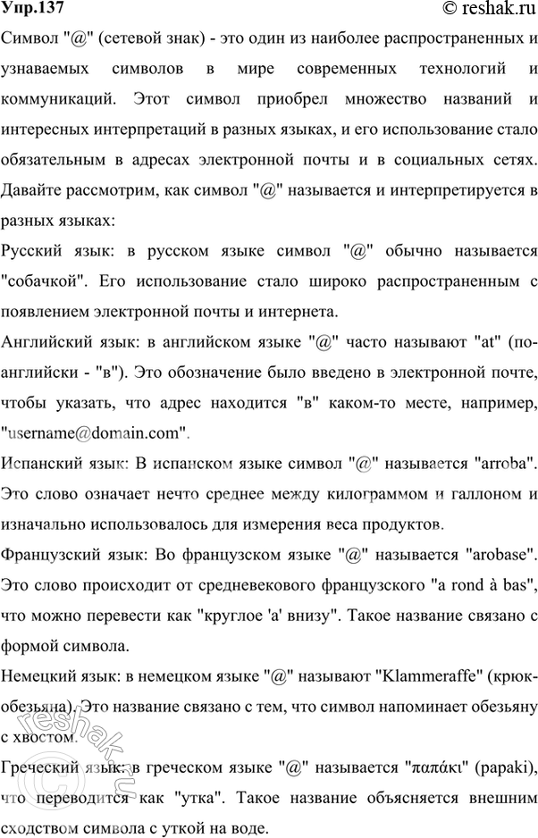 137. Вам наверняка известен знак @ что вы знаете о его значении и происхождении? Соберите материал и подготовьте проект на тему «Сетевой знак @ в разных языках».