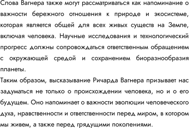 Таким образом, высказывание Ричарда Вагнера призывает нас задуматься не только о происхождении человека, но и о его будущем. Оно напоминает о важности эволюции человеческого духа, нравственности и ответственности перед миром, в котором мы живем, а также перед грядущими поколениями.