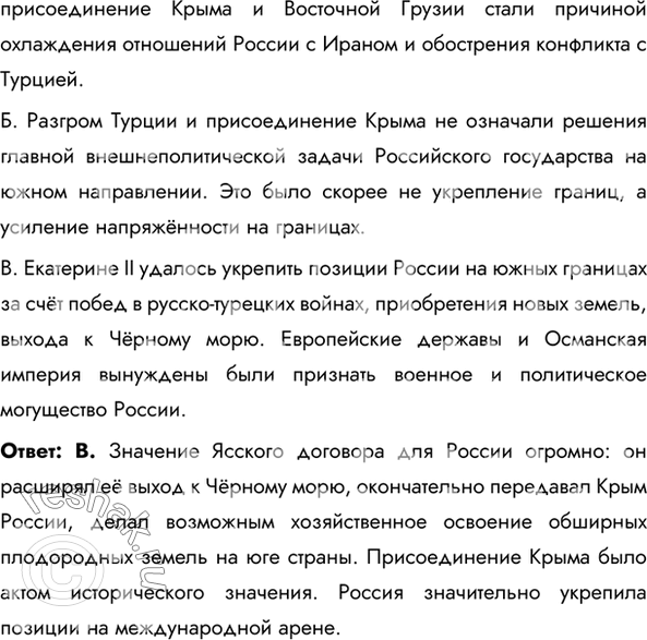 Б. Разгром Турции и присоединение Крыма не означали решения главной внешнеполитической задачи Российского государства на южном направлении. Это было скорее не укрепление границ, а усиление напряжённости на границах.