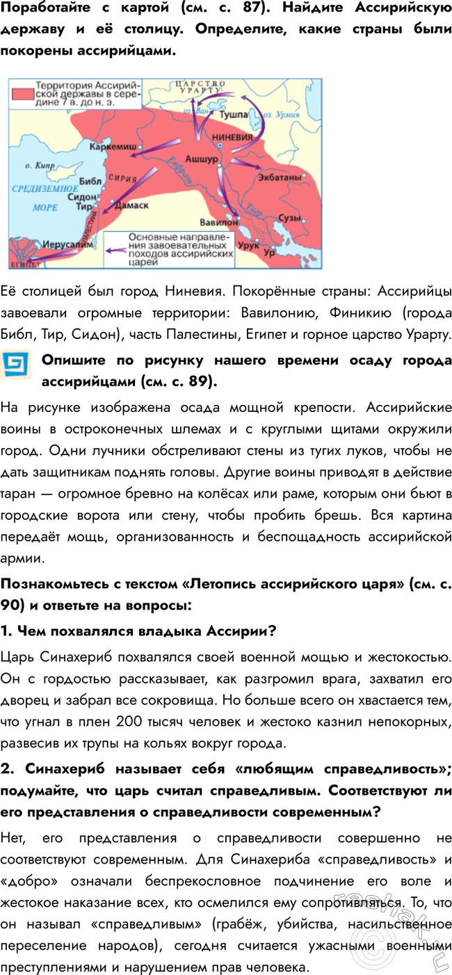 Поработайте с картой (см. с. 87). Найдите Ассирийскую державу и её столицу. Определите, какие страны были покорены ассирийцами.