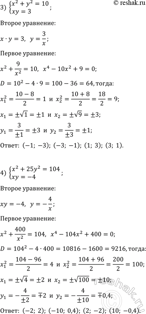 2) {x^2+4xy+4y^2=4x+2y, x+2y=4}; 4) {x^2+25y^2=104, xy=-4}.