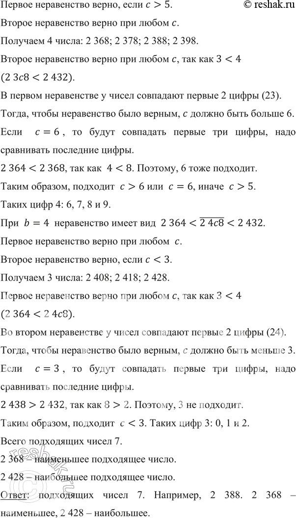 Запишите какое-либо натуральное число, которое больше 2 364 и меньше 2 432, содержащее цифру 8 в разряде единиц. Сколько таких чисел можно написать? Запишите наименьшее и наибольшее из таких чисел.