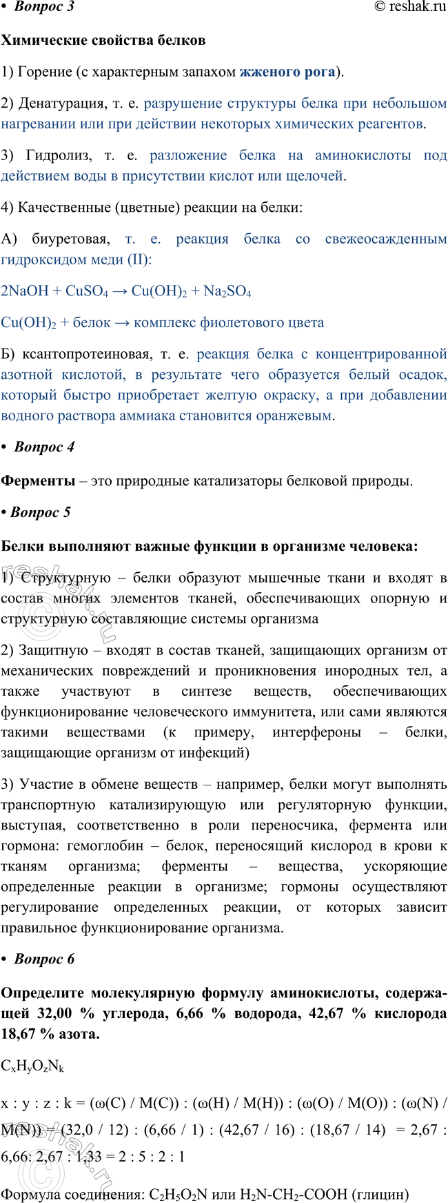 3) Гидролиз, т. е. разложение белка на аминокислоты под действием воды в присутствии кислот или щелочей.