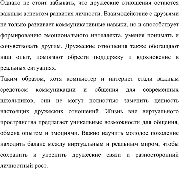 Таким образом, компьютер может быть полезным инструментом, но он не способен полностью заменить друзей. Дружеские отношения оставаются одним из важнейших аспектов нашей жизни, обогащающими её и делающими её более полной и насыщенной.