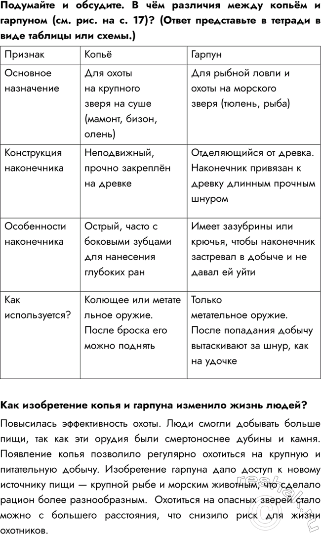 Подумайте и обсудите. В чём различия между копьём и гарпуном (см. рис. на с. 17)? (Ответ представьте в тетради в виде таблицы или схемы.)