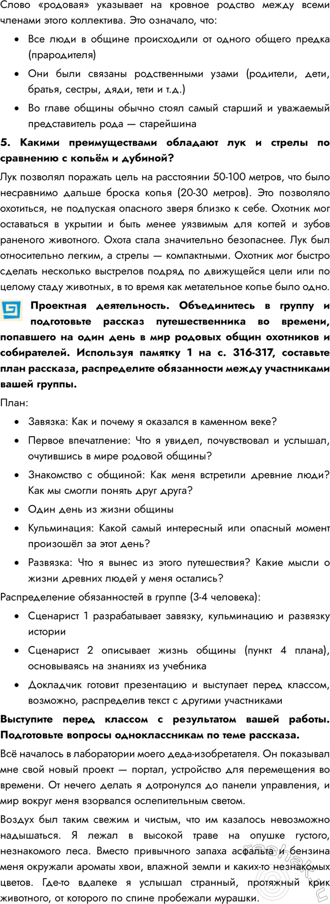 Проектная деятельность. Объединитесь в группу и подготовьте рассказ путешественника во времени, попавшего на один день в мир родовых общин охотников и собирателей. Используя памятку 1 на с. 316-317, составьте план рассказа, распределите обязанности между участниками вашей группы.