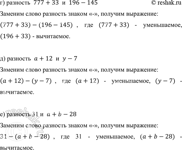 в) сумма 107 и z - d + 14; е) разность 31 и a + b - 28.