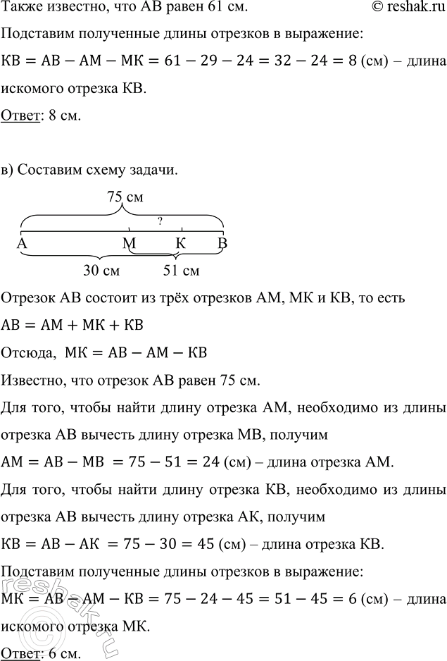 в) расстояние между точками M и K, если AB = 75 см, AK = 30 см, MB = 51 см.