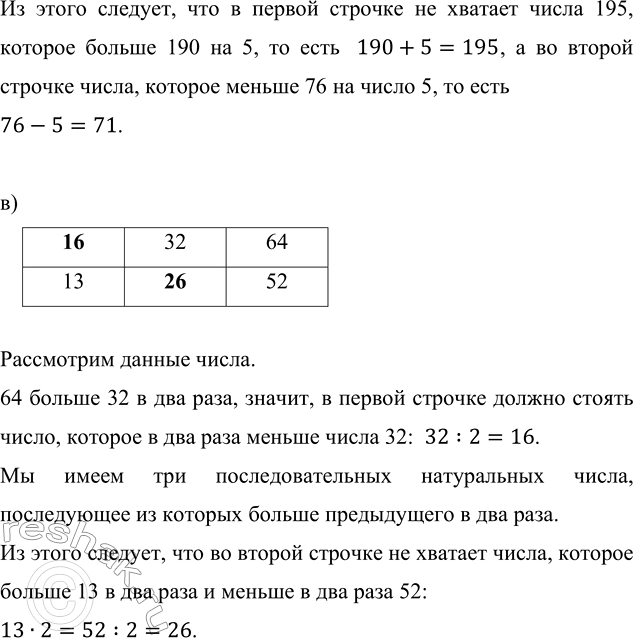 Из этого следует, что в первой строчке не хватает числа 195, которое больше 190 на 5, то есть 190+5=195, а во второй строчке числа, которое меньше 76 на число 5, то есть