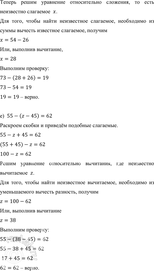 б) 115 - (35 + y) = 39; д) 73 -(x + 26) = 19;