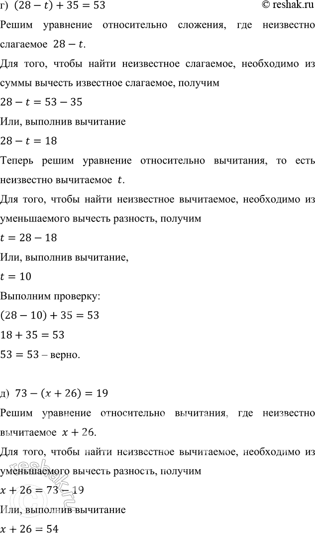 а) (x + 27) - 12 = 42; г) (28 - t) + 35 = 53;
