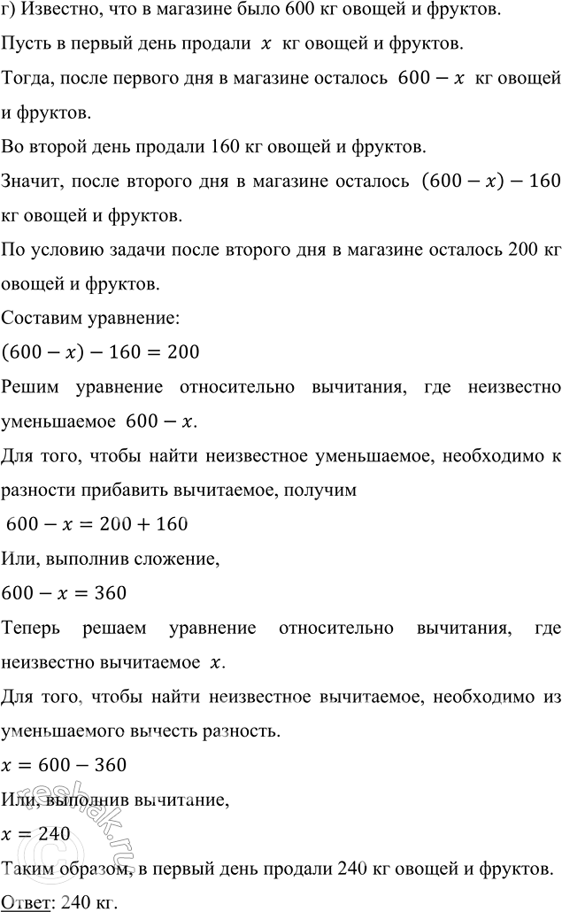 г) В магазине было 600 кг овощей и фруктов. Из них 160 кг продали во второй день, после чего осталось 200 кг овощей и фруктов. Сколько продали в первый день?