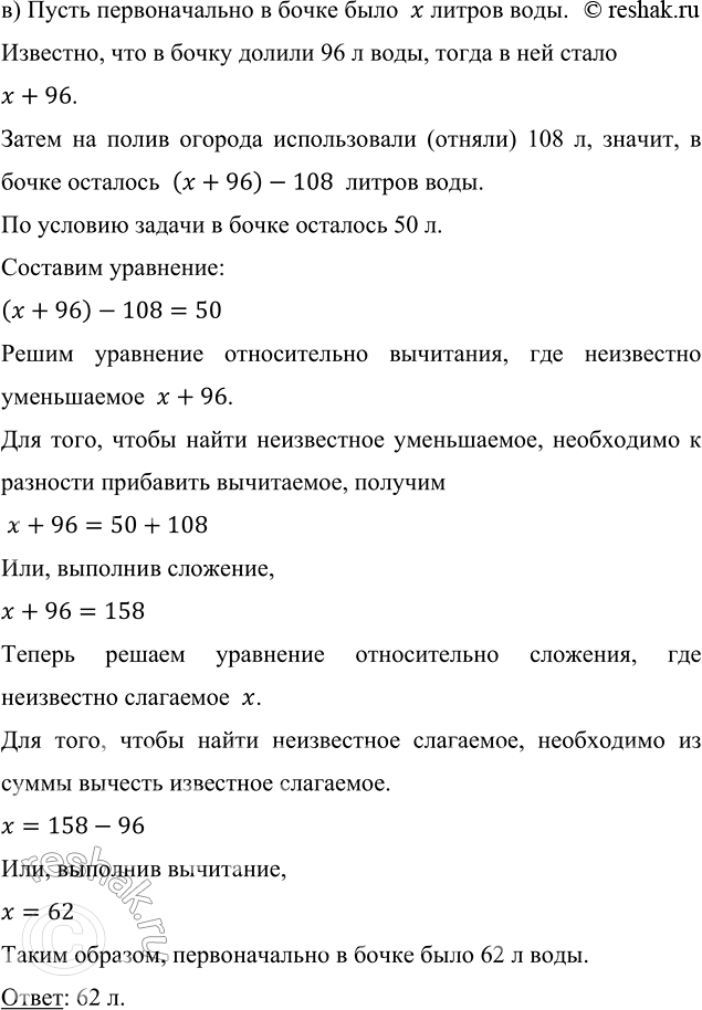 в) Сколько литров воды было в бочке первоначально, если в неё сначала долили 96 л воды, затем на полив огорода использовали 108 л и в ней осталось 50 л воды?