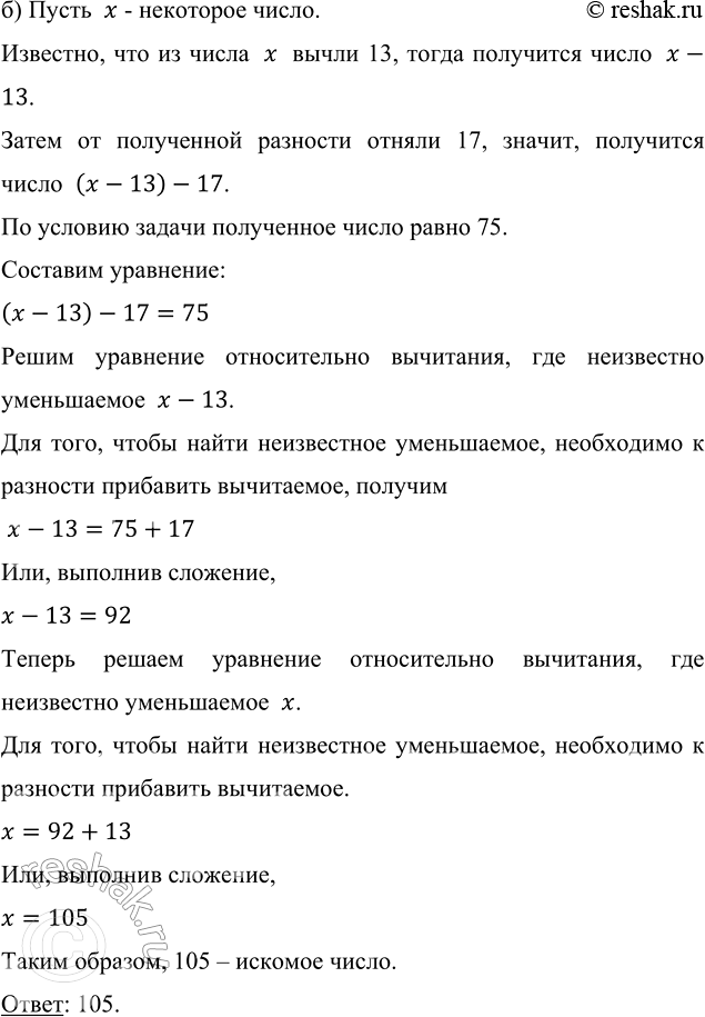 б) Если из некоторого числа вычесть 13 и от полученной разности отнять 17, то получим 75. Найдите это число.