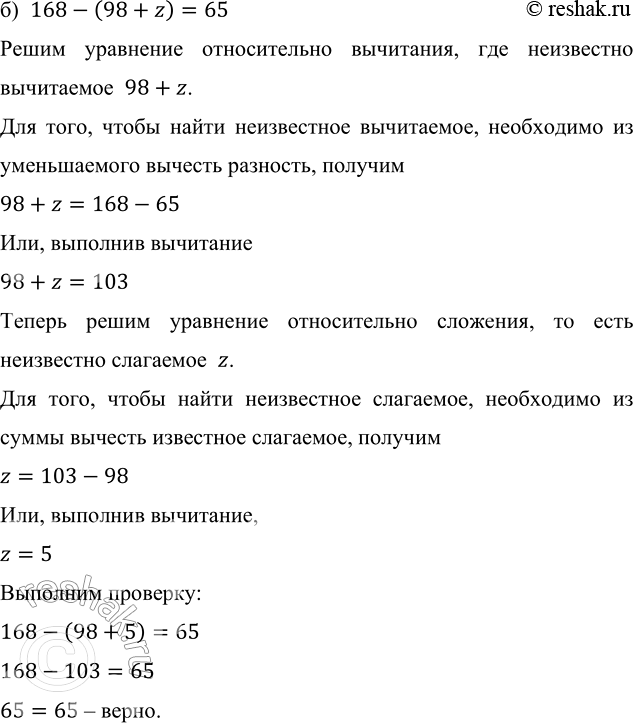 а) (x + 155) - 35 = 145; б) 168 -(98 + z) = 65.