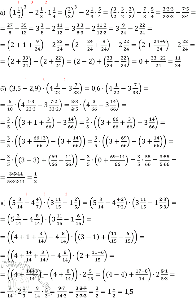 в) (5 3/14 - 4 4/7) · (3 11/15 - 1 2/5).