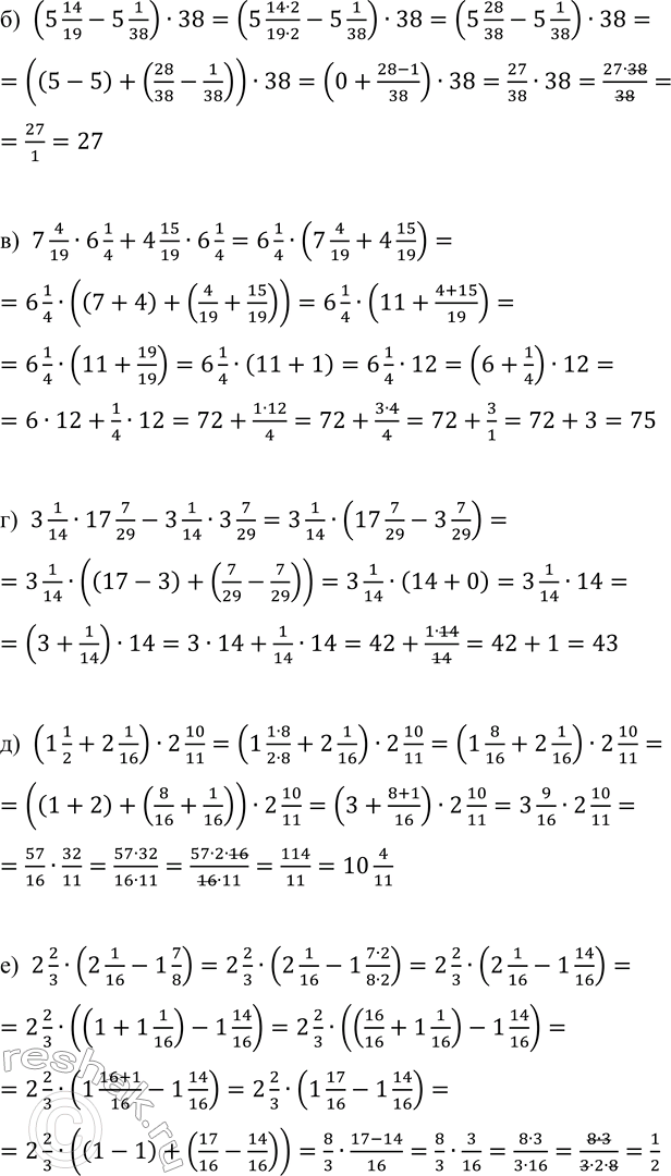 б) (5 14/19 - 5 1/38) · 38; г) 3 1/14 · 17 7/29 - 3 1/14 · 3 7/29; е) 2 2/3 · (2 1/16 - 1 7/8).