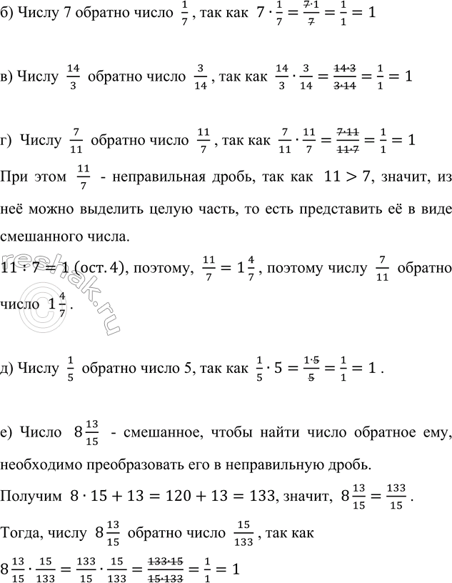 б) Числу 7 обратно число 1/7 , так как 7•1/7=(7•1)/7=1/1=1