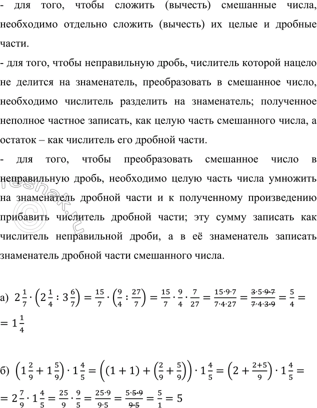 б) (1 2/9 + 1 5/9) · 1 4/5; г) (2 2/15 - 1 2/5) · 6 1/4; е) (7 1/8 - 6 3/5) : 4 1/5.