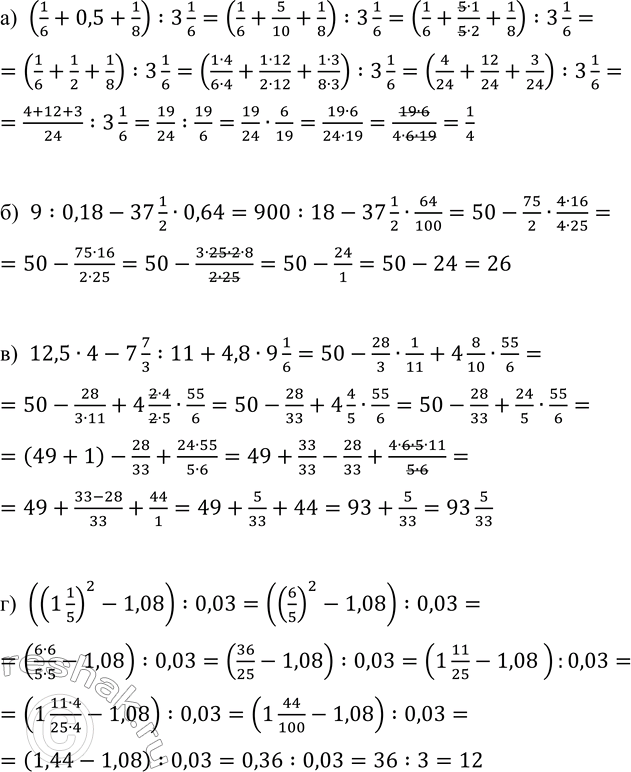 а) (1/6 + 0,5 + 1/8) : 3 1/6; в) 12,5 · 4 - 7 7/3 : 11 + 4,8 · 9 1/6;