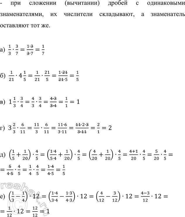 д) (1/5 + 1/20) · 4/5; е) (1/3 - 1/4) · 12.