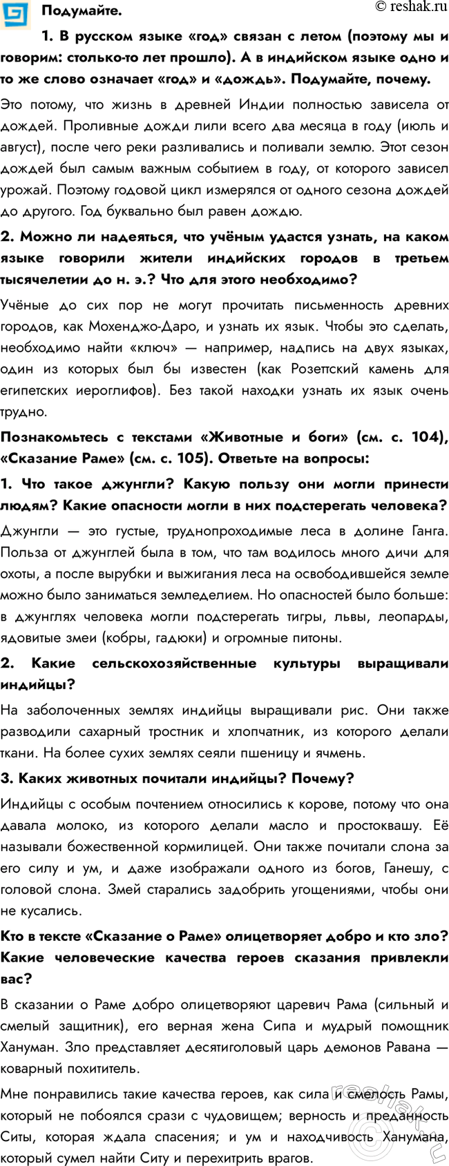 Познакомьтесь с текстами «Животные и боги» (см. с. 104), «Сказание Раме» (см. с. 105). Ответьте на вопросы: