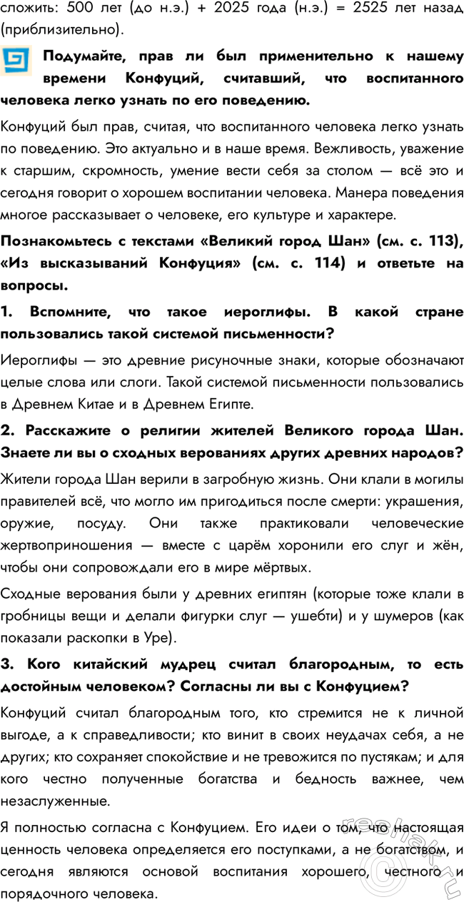 Познакомьтесь с текстами «Великий город Шан» (см. с. 113), «Из высказываний Конфуция» (см. с. 114) и ответьте на вопросы.