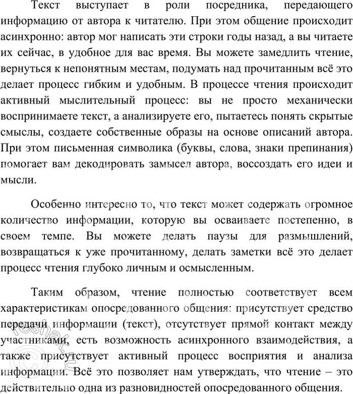 Таким образом, чтение полностью соответствует всем характеристикам опосредованного общения: присутствует средство передачи информации (текст), отсутствует прямой контакт между участниками, есть возможность асинхронного взаимодействия, а также присутствует активный процесс восприятия и анализа информации. Всё это позволяет нам утверждать, что чтение – это действительно одна из разновидностей опосредованного общения.