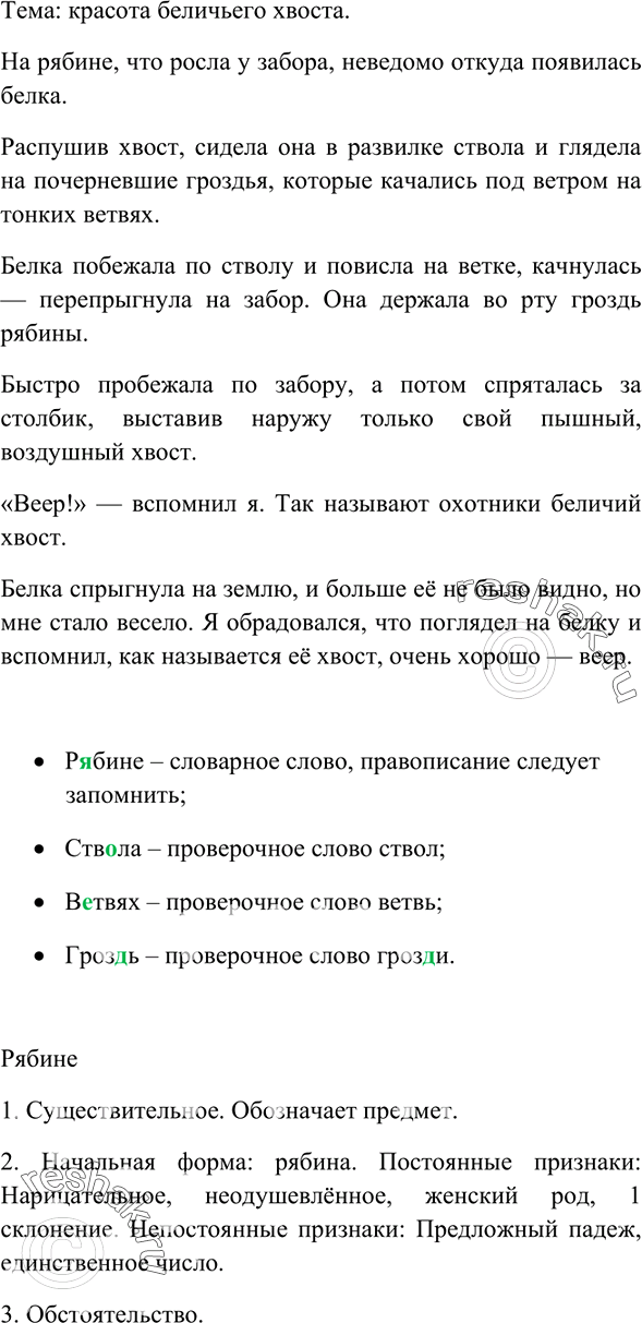 Белка побежала по стволу и повисла на ветке, качнулась - перепрыгнула на забор. Она держала во рту гроздь (проверочное слово: грозди) рябины.