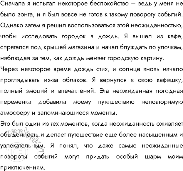 Сначала я испытал некоторое беспокойство – ведь у меня не было зонта, и я был вовсе не готов к такому повороту событий. Однако затем я решил воспользоваться этой неожиданностью, чтобы исследовать городок в дождь. Я вышел из кафе, спрятался под крышей магазина и начал блуждать по улочкам, наблюдая за тем, как дождь меняет городскую картину.