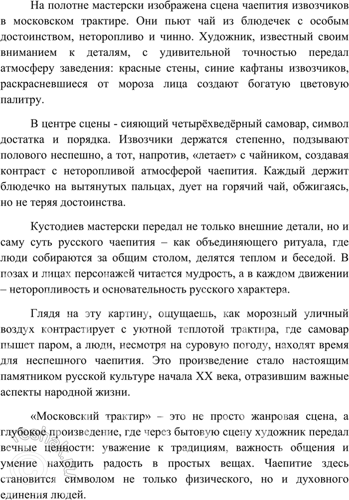 «Московский трактир» – это не просто жанровая сцена, а глубокое произведение, где через бытовую сцену художник передал вечные ценности: уважение к традициям, важность общения и умение находить радость в простых вещах. Чаепитие здесь становится символом не только физического, но и духовного единения людей.