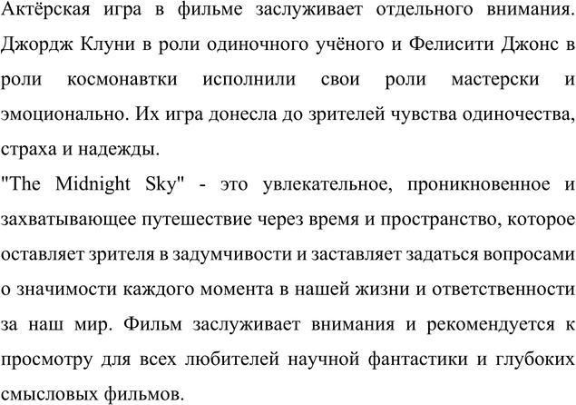 "The Midnight Sky" - это увлекательное, проникновенное и захватывающее путешествие через время и пространство, которое оставляет зрителя в задумчивости и заставляет задаться вопросами о значимости каждого момента в нашей жизни и ответственности за наш мир. Фильм заслуживает внимания и рекомендуется к просмотру для всех любителей научной фантастики и глубоких смысловых фильмов.