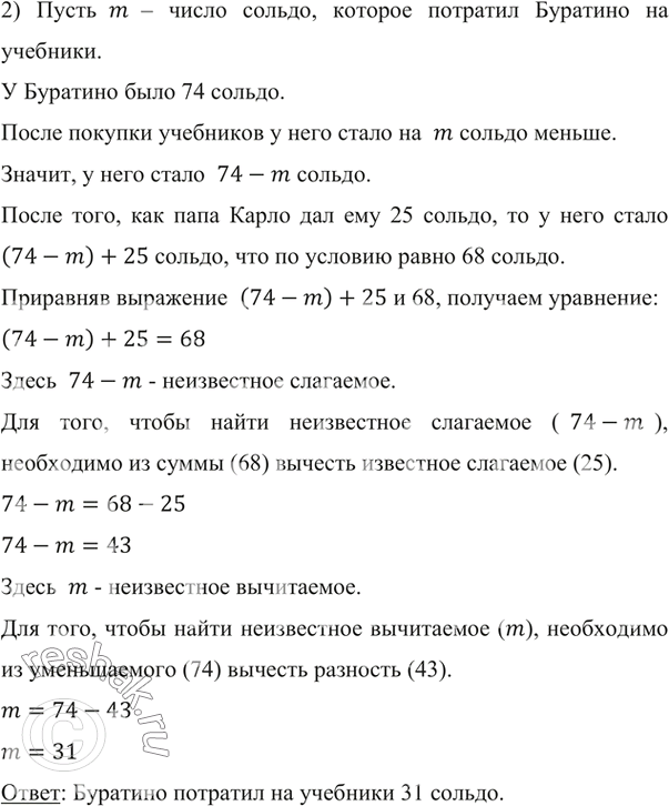 2) У Буратино было 74 сольдо. После того как он купил себе учебники для школы, папа Карло дал ему 25 сольдо. Тогда у Буратино стало 68 сольдо. Сколько сольдо потратил Буратино на учебники?