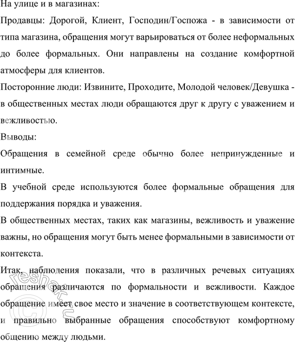 В течение нескольких дней понаблюдайте, как вы обращаетесь к знакомым и незнакомым людям, к своим родственникам дома, в школе, на улице, в магазине и т. д. А как обращаются к вам? Запишите эти обращения. Какие из них являются распространёнными, а какие — нераспространёнными? Объясните, почему в той или иной речевой ситуации использовано именно данное обращение. Правильно ли каждое из них? Вежливо ли оно? Оформите наблюдения в виде небольшого по объёму доклада.