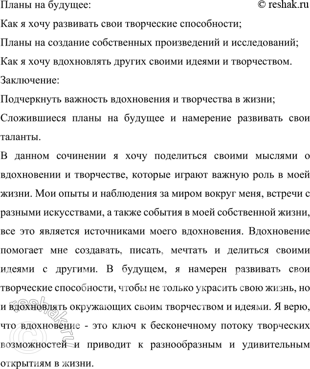 В данном сочинении я хочу поделиться своими мыслями о вдохновении и творчестве, которые играют важную роль в моей жизни. Мои опыты и наблюдения за миром вокруг меня, встречи с разными искусствами, а также события в моей собственной жизни, все это является источниками моего вдохновения. Вдохновение помогает мне создавать, писать, мечтать и делиться своими идеями с другими. В будущем, я намерен развивать свои творческие способности, чтобы не только украсить свою жизнь, но и вдохновлять окружающих своим творчеством и идеями. Я верю, что вдохновение - это ключ к бесконечному потоку творческих возможностей и приводит к разнообразным и удивительным открытиям в жизни.