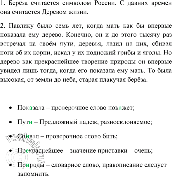 Павлику было семь лет, когда мать как бы впервые показала (проверочное слово: покажет) ему дерево. Конечно, он и до этого тысячу раз встречал на своём пути (путь, разносклоняемое, предложный падеж) деревья, лазил на них, сбивал (проверочное слово: сбить) ноги об их корни, искал у их подножий грибы и ягоды. Но дерево как прекраснейшее (словарное слово) творение (чередование -твор-/-твар-, в безударном положении пишется гласная о: творение) природы (словарное слово) он впервые увидел лишь тогда, когда его показала (проверочное слово: покажет) ему мать. То была высокая, от земли до неба, старая плакучая берёза.