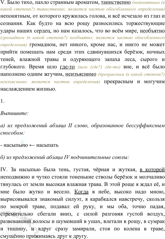 1. Выпишите: из предложений абзаца II слово, образованное бес-суффиксным способом; из предложений абзаца IV подчинительные союзы; из последнего предложения абзаца V словосочетание со связью управление; из предпоследнего предложения абзаца V составное глагольное сказуемое.